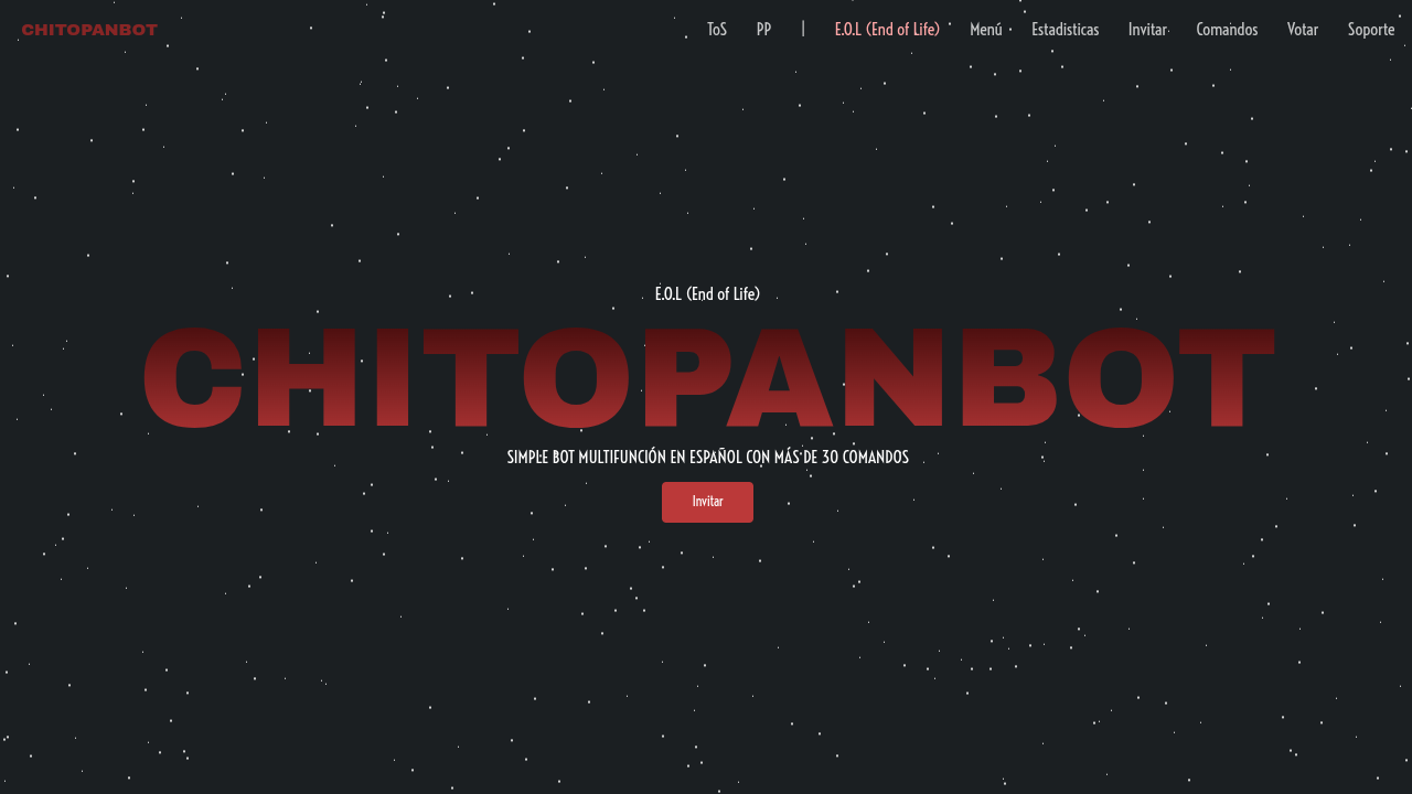 La página web del bot de discord ChitoPanBOT. Puedes ver alguno de sus comandos con una breve descripción de los mismos, Estádisticas de ChitoPanBOT (Cantidad de servidores, usuarios, latencia, etc) y links.